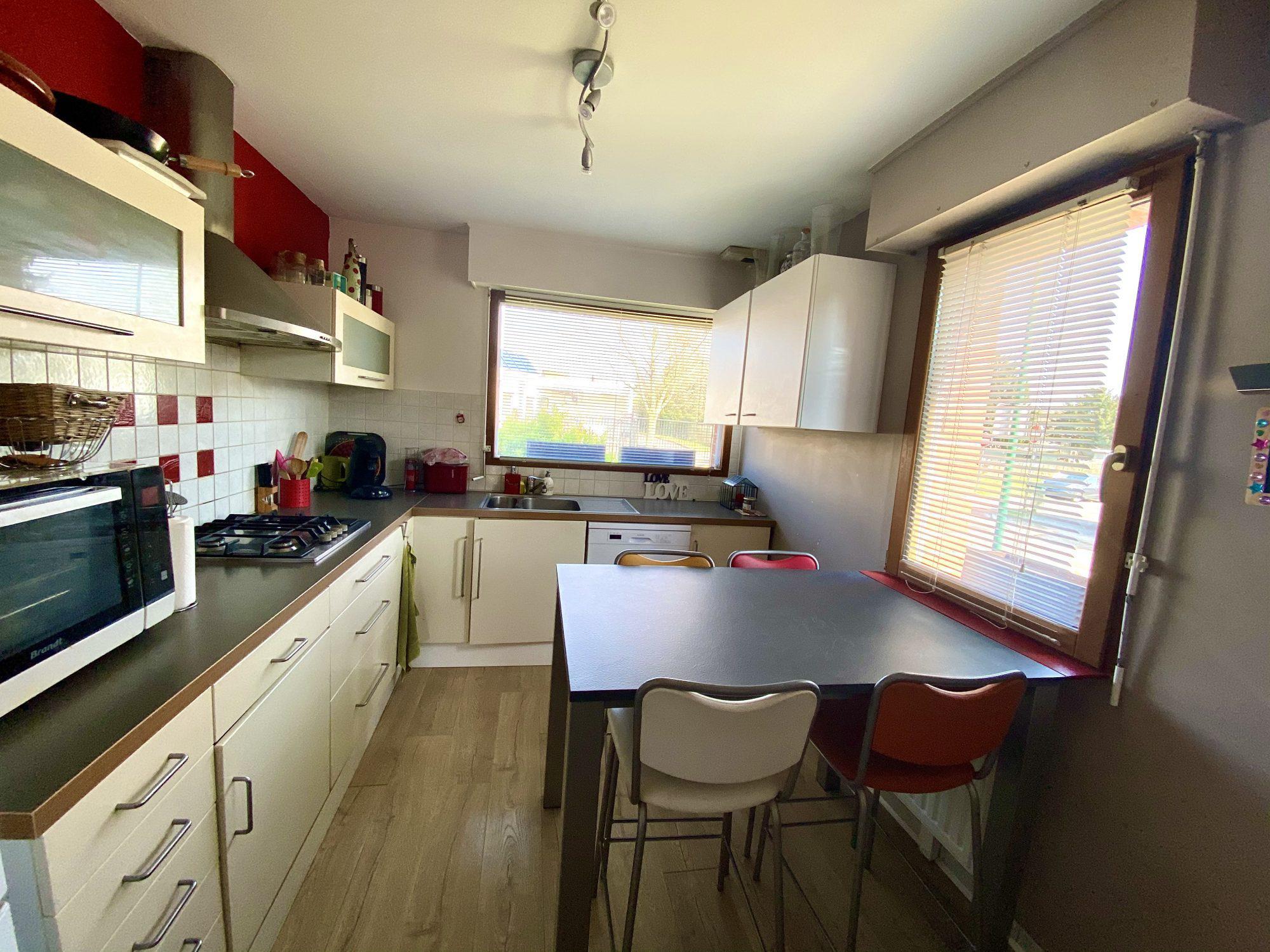 Une cuisine où l’ on peut prendre ses repas, un beau séjour donnant sur terrasse et jardin agréable bien proportionné